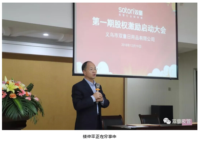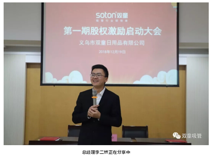 “今天,我從樓總手上接過股權(quán)激勵的證書,我的內(nèi)心更加激動和深刻,我的角色轉(zhuǎn)變?yōu)楣竞匣锶?。但這也只是一個開始,未來,我們或許會經(jīng)歷很多的困難,但我始終相信我們可以完成5年后的目標(biāo)。讓我們在一起少一些抱怨,多一些團(tuán)結(jié),多一些付出,為‘雙童’更好的明天努力奮斗!”