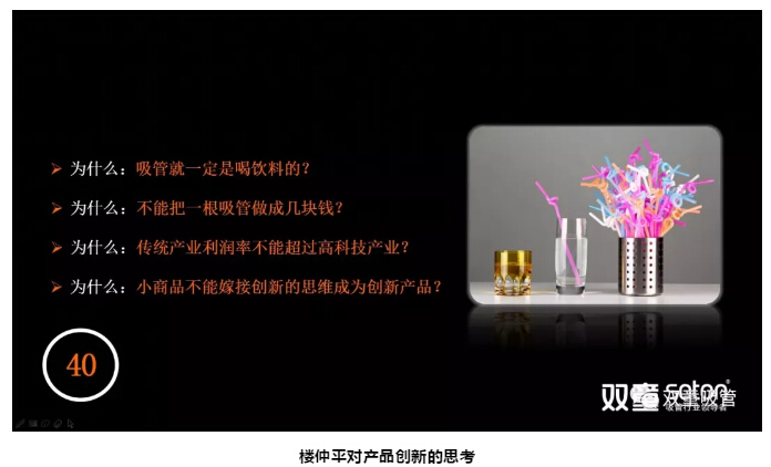 吸管在傳統(tǒng)認(rèn)知中是典型的“低、小、散、弱”的小商品!但樓仲平偏偏不信這個(gè)邪,從2003年之后,他逐漸開(kāi)始“不務(wù)正業(yè)”思考“產(chǎn)品 Vs 商品”的關(guān)系,從而引發(fā)思考:
