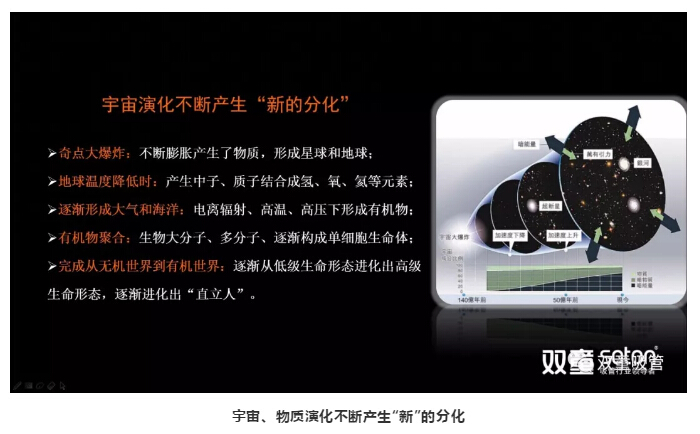 接下來(lái),樓仲平通過(guò)宇宙演化的例子讓大家對(duì)創(chuàng)新有更深的理解:宇宙起源于奇點(diǎn)大爆炸,通過(guò)宇宙的演化不斷產(chǎn)生新的物質(zhì),繼而形成星球和地球,產(chǎn)生有機(jī)物及生命,形成不斷“新”的分化。