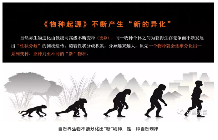 隨后,樓仲平也同樣用達(dá)爾文的《物種起源》作為案例,在物種演化的過(guò)程中,不斷產(chǎn)生測(cè)枝遺傳,隨著性狀分歧積累,分異越來(lái)越大,從而不斷產(chǎn)生“新”的物種!