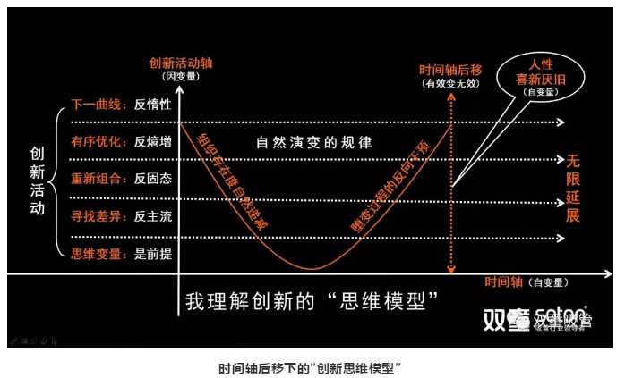 在自變量的時(shí)間軸中,隨著時(shí)間后移,人性中的“喜新厭舊”發(fā)生作用,創(chuàng)新有效變無(wú)效,從而需要持續(xù)創(chuàng)新,無(wú)窮無(wú)盡……