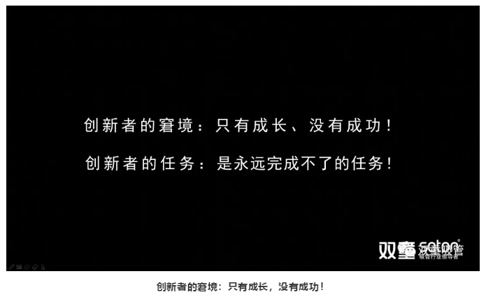 所以,創(chuàng)新是創(chuàng)業(yè)活動(dòng)的“應(yīng)變反饋”,是“墮變過(guò)程”的“反向調(diào)整”。創(chuàng)新者的任務(wù)是永遠(yuǎn)完成不了的任務(wù),只要?jiǎng)?chuàng)業(yè)持續(xù),創(chuàng)新就需要“無(wú)限延展”!創(chuàng)新者的窘境在于只有成長(zhǎng),沒(méi)有成功!