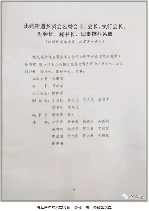 因此,大會(huì)上討論通過(guò)了北苑街道鄉(xiāng)賢會(huì)章程(草案)、北苑街道鄉(xiāng)賢會(huì)選舉辦法(草案)、選舉產(chǎn)生了北苑街道鄉(xiāng)賢會(huì)名譽(yù)會(huì)長(zhǎng)、會(huì)長(zhǎng)、執(zhí)行會(huì)長(zhǎng)、副會(huì)長(zhǎng)、秘書(shū)長(zhǎng)以及理事成員。其中“雙童”樓仲平被推選為北苑街道鄉(xiāng)賢會(huì)執(zhí)行會(huì)長(zhǎng)。