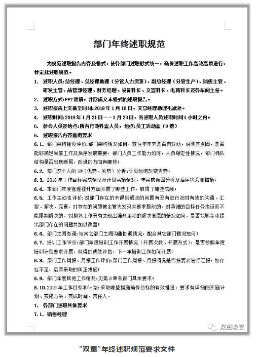 在述職報告之前,總經(jīng)辦會向各部門下達年終述職規(guī)范文件,擬定各部門述職報告的通用要求和具體要求,規(guī)定述職報告上交時間。