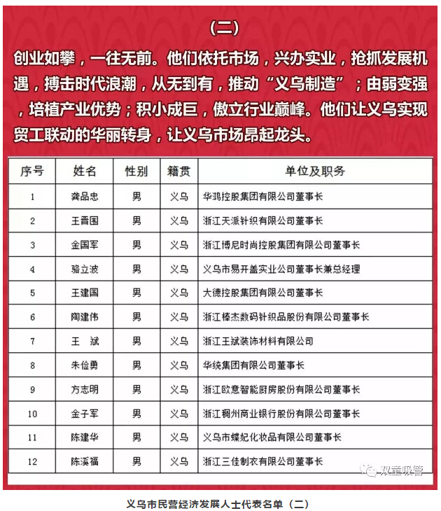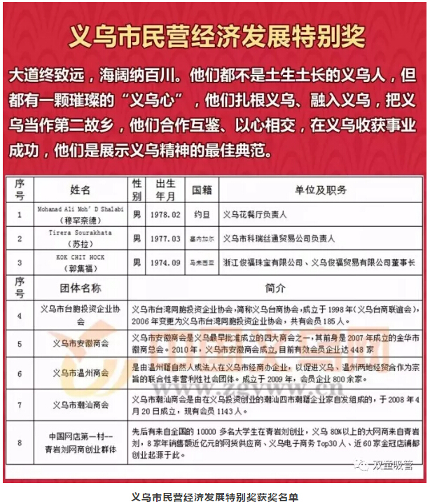 同時(shí),此次大會(huì)還對(duì)以下的義烏市民營(yíng)經(jīng)濟(jì)發(fā)展代表人士進(jìn)行了頒獎(jiǎng)表彰!