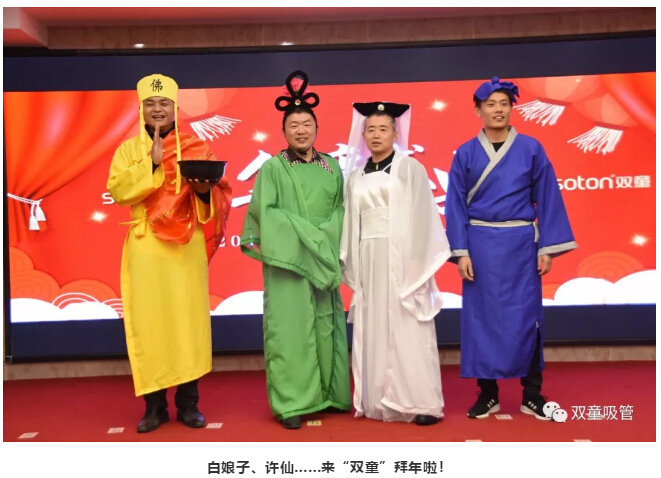 “雙童”年會的高潮節(jié)目來了!負(fù)責(zé)生產(chǎn)的副總經(jīng)理李秀前攜三大車間主任化身《白蛇傳》經(jīng)典人物前來拜年了,白娘子撒嬌、小青選白蛇王子、合唱《千年等一回》…… 逗得現(xiàn)場觀眾們捧腹大笑!