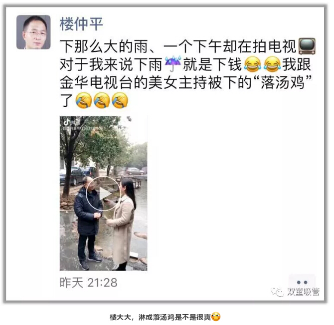 當(dāng)家人樓仲平也在朋友圈感慨,這么多次接受媒體采訪淋著雨還是第一次!哈哈!樓大大,淋成落湯雞的感覺(jué)爽不爽呀!