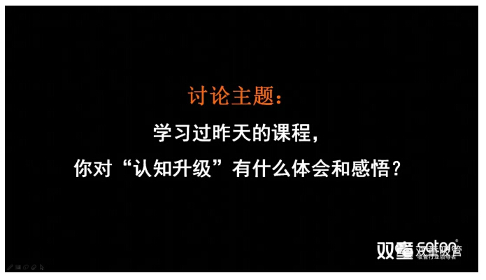 在聽完傅盛老師的課程之后,大家圍繞“你對(duì)‘認(rèn)知’升級(jí)”有什么體會(huì)和感悟”進(jìn)行分組討論,每位組員都要提煉表達(dá)出自己的觀點(diǎn),各小組進(jìn)行總結(jié)后輪流進(jìn)行分享。