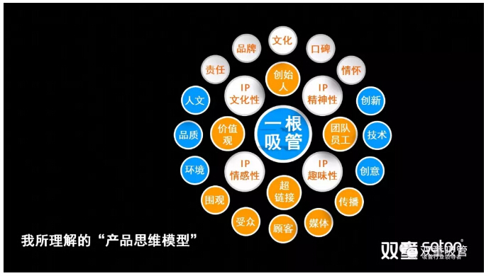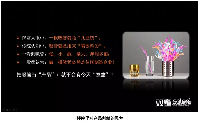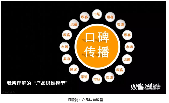 讓員工們自身對(duì)“產(chǎn)品”和“商品”有所思考之后,樓仲平以“一根吸管”為例,詮釋了全新思維的“產(chǎn)品認(rèn)知模型”: