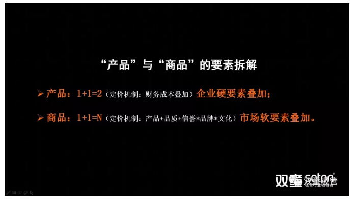 但商品是將產(chǎn)品、品質(zhì)、品牌、文化等市場(chǎng)軟要素疊加,1+1=N。在產(chǎn)品本身內(nèi)核不發(fā)生改變的情況下,產(chǎn)品之外的文化性、精神性、趣味性、情感性等屬性不斷地外延,通過“創(chuàng)始人”、“團(tuán)隊(duì)員工”、“價(jià)值觀”、“超鏈接”等又形成了產(chǎn)品的種種不同屬性。