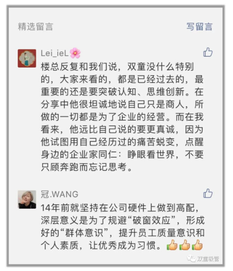 我和樓總其實之前就認(rèn)識,2017年我?guī)е懈邔觼磉^,但是今天來,感覺變化很大、企業(yè)文化建設(shè)很完善。您剛才提到2016、2017年企業(yè)的陣痛我之前沒想到,我們公司也是近兩年進(jìn)入快速發(fā)展期,人才跟不上。原來想踩剎車、慢一點,現(xiàn)在我更堅定要跑快一點。今年,我決定我們整個公司就定下來要學(xué)習(xí)“雙童”。