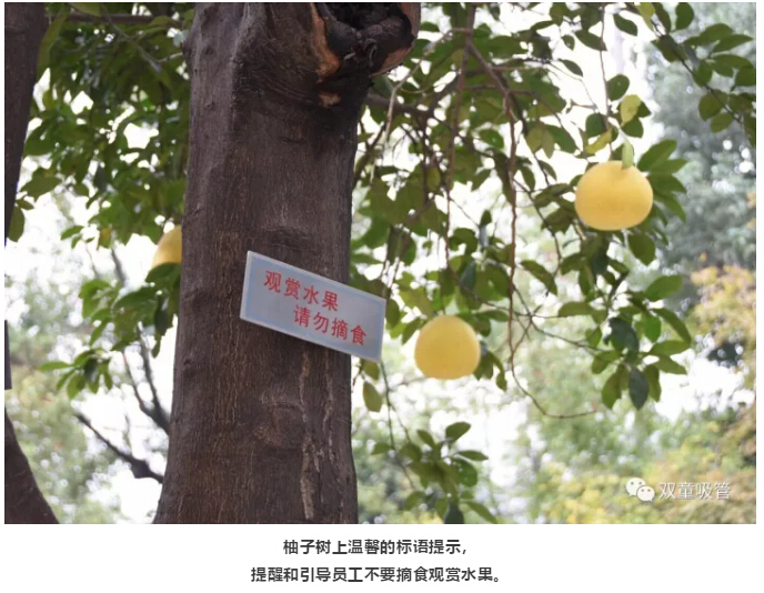 其實(shí),為了“雙童”的生態(tài)和美觀,公司明確柚子是觀賞性水果,每棵柚子樹(shù)上都有“觀賞水果,請(qǐng)勿摘食”的字樣,提醒和引導(dǎo)員工不要摘食觀賞水果。