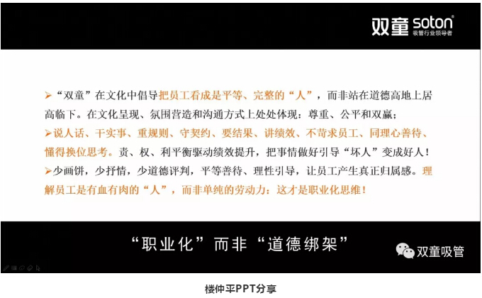 在看完樓仲平的視頻之后,可能很多人會心存疑慮:“雙童”明明是倡導"家文化"的企業(yè),竭盡所能對員工好,為什么不能讓員工在企業(yè)里談人情、感恩和奉獻呢,這難道不矛盾嗎?