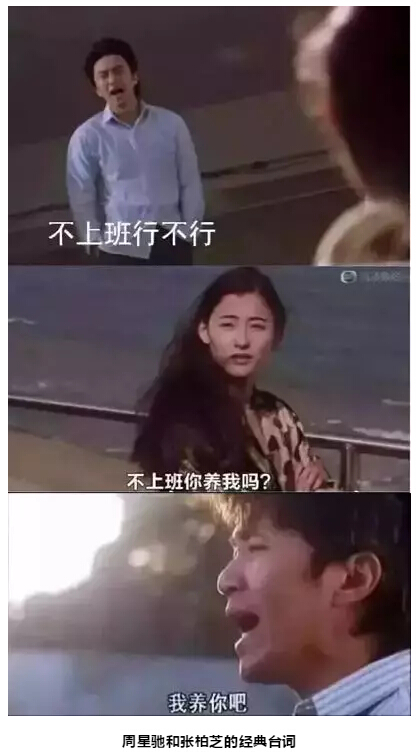 “不上班行不行啊?”“不上班你養(yǎng)我嗎?”“我養(yǎng)你??!”這不是周星馳和張柏芝在《喜劇之王》的經(jīng)典臺(tái)詞嘛!