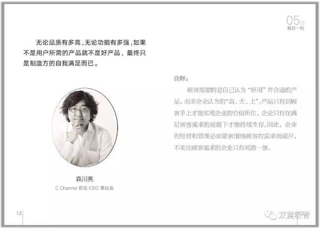 無論品質(zhì)有多高,無論功能有多強(qiáng),如果不是用戶所需的產(chǎn)品就不是好產(chǎn)品,最終只是制造方的自我滿足而已。——森川亮