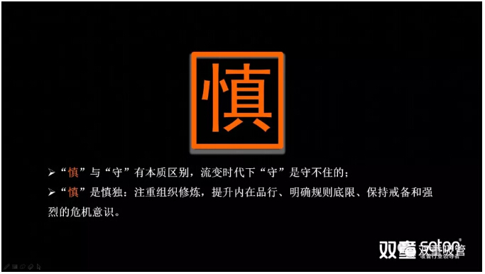 緊接著,樓仲平圍繞“慎”一詞和大家展開(kāi)分享。流變時(shí)代下,“守”是守不住的。對(duì)企業(yè)來(lái)說(shuō),要認(rèn)識(shí)到這個(gè)時(shí)代給我們帶來(lái)的巨變沖擊,并知道自己的不足和短板,所以,“慎”是保持謹(jǐn)慎、戒備和危機(jī)。