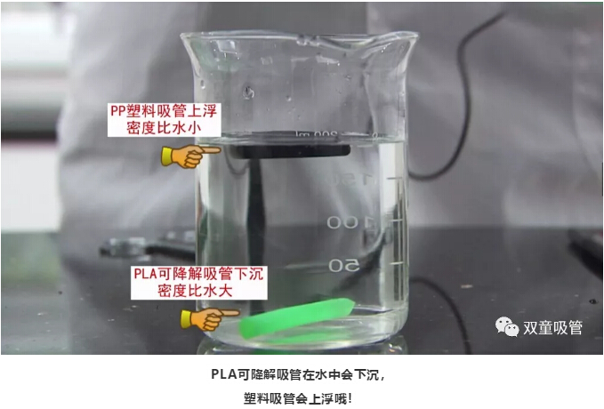 可降解吸管的密度是1.25g/cm3,塑料吸管的密度0.913g/cm3。將兩根吸管分別放入水中,由于密度不同,塑料吸管會(huì)浮起來,可降解吸管會(huì)沉下去,以此來區(qū)別兩種吸管。