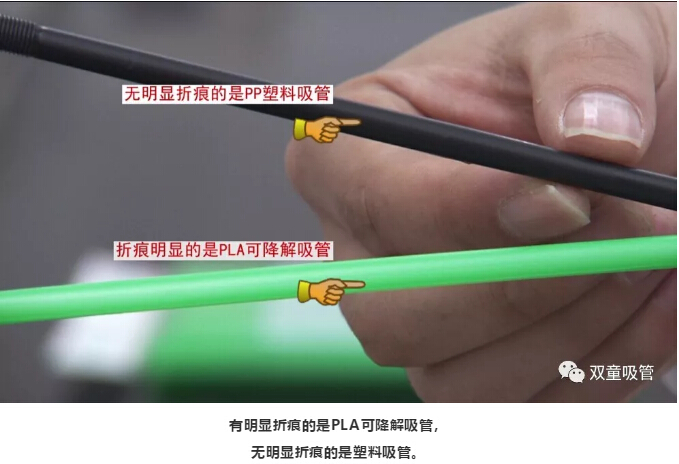將可降解吸管和塑料吸管對(duì)折,塑料吸管的韌性較好,折過之后會(huì)反彈。可降解吸管的材料是從玉米淀粉中提取的,韌性沒有塑料吸管好,折過之后容易扁,以此來區(qū)別兩種吸管。