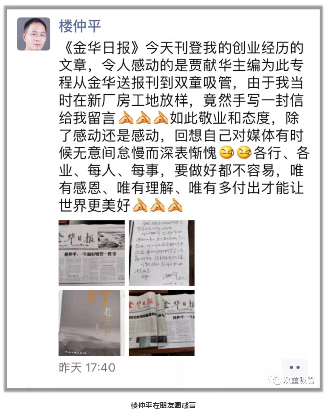 近日,《金華日?qǐng)?bào)》刊登了一篇《樓仲平:一生做好一件事》的文章,專題報(bào)道樓仲平的創(chuàng)業(yè)經(jīng)歷。值得一提的是,在文章刊登后,《金華日?qǐng)?bào)》賈獻(xiàn)華主編專程從金華送報(bào)刊到雙童吸管,其敬業(yè)的態(tài)度讓人欽佩!快來(lái)看看采訪正文吧!