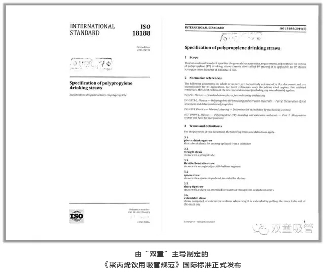 作為全球吸管行業(yè)領(lǐng)導(dǎo)者,這些年義烏市雙童日用品有限公司先后承擔(dān)聚乳酸冷飲吸管中國(guó)輕工行業(yè)標(biāo)準(zhǔn)、聚丙烯飲用吸管國(guó)家標(biāo)準(zhǔn)和聚丙烯飲用吸管規(guī)范ISO國(guó)際標(biāo)準(zhǔn)的起草編制工作。全球吸管行業(yè)國(guó)際標(biāo)準(zhǔn)的相關(guān)組織要求、生產(chǎn)過(guò)程、規(guī)則驗(yàn)收、依據(jù)評(píng)判等絕大部分標(biāo)準(zhǔn)條文均來(lái)自義烏市雙童日用品有限公司。