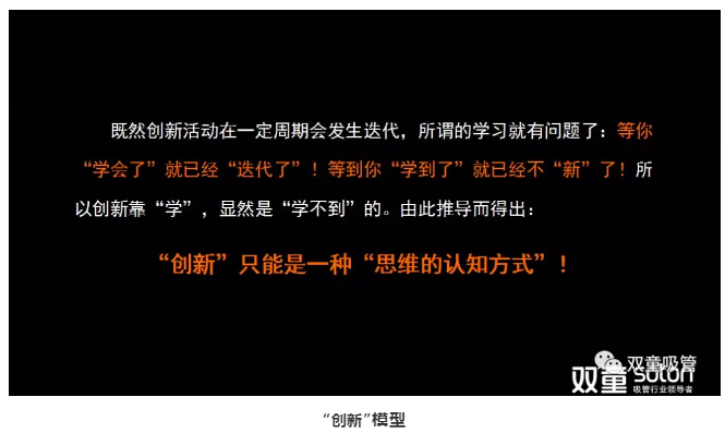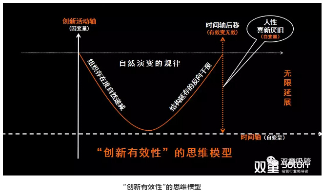 經(jīng)過前兩個“思維模型”的鋪墊,最后,樓仲平引導(dǎo)大家認(rèn)知:昨天還是“創(chuàng)新”的東西,今天就未必還是“新”。所以,“創(chuàng)新”是有“時間軸”的,隨著“時間軸”不斷后移,原有的“創(chuàng)新”有效變成了無效,創(chuàng)新活動也就“無窮無盡”!