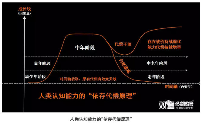 在該模型中,我們能夠看到人類的認(rèn)知從幼少年階段開始,經(jīng)過青年階段,到達(dá)中年階段的巔峰期。但隨著年齡的不斷增長,人類的認(rèn)知能力開始自然遞減,最終接近幼少年時期的認(rèn)知能力。在這個過程中,如果人類想要改變這一自然的“墮變規(guī)律”,就必然需要通過“代償干預(yù)”,對自身進(jìn)行不斷地調(diào)整和干預(yù),從而讓認(rèn)知能力從“下墮”走向“上揚(yáng)”,讓能力代償持續(xù)增量!