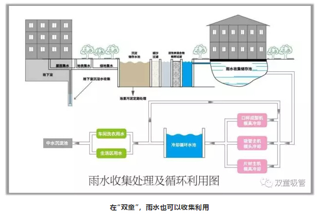 “雙童”建立了雨水收集系統(tǒng),通過在屋頂、路面、綠化中做好雨水收集點(diǎn),每年能為“雙童”收集到5—6萬噸的雨水!這些雨水在經(jīng)過科學(xué)過濾后,可以作為消防用水、車間模具冷卻用水、生活區(qū)用水,直接產(chǎn)生經(jīng)濟(jì)效益近40多萬元。