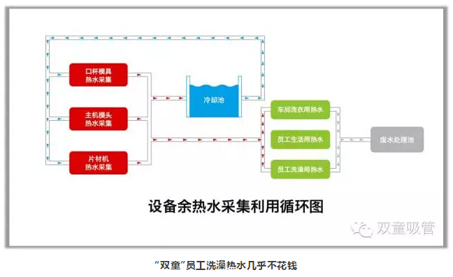 另外,公司考慮到能源節(jié)約和排放的控制,實(shí)施了設(shè)備余熱水循環(huán)系統(tǒng)以及設(shè)備余熱采集系統(tǒng)。設(shè)備余熱水循環(huán)系統(tǒng)通過對車間內(nèi)所有經(jīng)過模具的50度溫水進(jìn)行收集,處理之后供應(yīng)到所有寢室衛(wèi)生間給員工洗澡洗衣生活之用,從而高效利用了余熱能源。