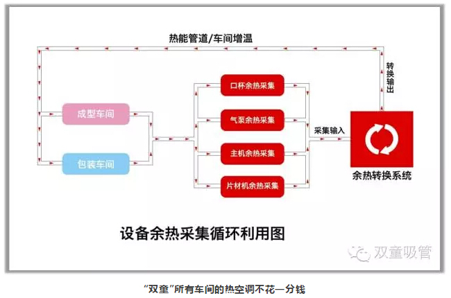 考慮到“雙童”生產(chǎn)設(shè)備產(chǎn)生大量余熱的狀況,生產(chǎn)車間安裝了余熱采集裝置,把所有生產(chǎn)設(shè)備的余熱和廢氣進(jìn)行采集并回收,采集的余熱經(jīng)過凈化處理后再通過管道供應(yīng)給所有車間進(jìn)行二次能源的利用(熱空調(diào)現(xiàn)在不用了,節(jié)能了大量的電費(fèi))!