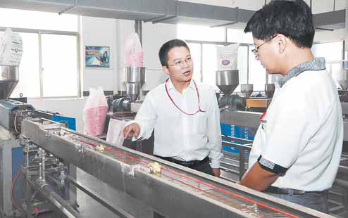 在雙童的生產(chǎn)工藝流程中,有這樣一個(gè)環(huán)節(jié),叫做原料經(jīng)過(guò)高溫?cái)D出吸管,“擠”出來(lái)的吸管需要用水來(lái)冷卻。過(guò)去,企業(yè)多用自來(lái)水對(duì)吸管進(jìn)行冷卻,冷卻以后,這些50 多度的熱水便被作為廢水進(jìn)行直接排放。也就是說(shuō),車間一邊進(jìn)自來(lái)水,一邊又馬上把冷卻水當(dāng)廢水放掉了。毫無(wú)疑問(wèn),這對(duì)用水量很大的雙童公司來(lái)說(shuō),是一筆不小的成本投入。善于精打細(xì)算的樓仲平自然不甘做這種賠本生意,經(jīng)過(guò)摸索,經(jīng)濟(jì)驅(qū)動(dòng)力催生出一套他自行研發(fā)設(shè)計(jì)的“工業(yè)循環(huán)用水回用系統(tǒng)”:在生產(chǎn)上, 50 多度的冷卻水通過(guò)冷卻塔降到常溫,再抽回車間,二次行使冷卻吸管的重任。它的功效在哪里?可以打個(gè)比方:假如企業(yè)擴(kuò)大規(guī)模后車間設(shè)備增加3 倍,那么沿襲一次性排放,用水量也是直接增加3 倍;而采用循環(huán)用水,企業(yè)用水量卻只增加1 倍。效果立時(shí)可顯。“一石二鳥(niǎo)”、“一箭雙雕”、“一舉兩得”,用怎樣的語(yǔ)言來(lái)形容這個(gè)“水循環(huán)系統(tǒng)”都不為過(guò)。因?yàn)?,除了生產(chǎn),“水循環(huán)系統(tǒng)”還有一個(gè)更大的妙用,這就是:一個(gè)“熱水回用”給員工洗澡解了天大的難題—— — 冷卻水吸收過(guò)吸管中的熱量后,可使水溫達(dá)到約50 多度,公司便“順手牽羊”把部分冷卻水抽到員工衛(wèi)生間,作為洗澡熱水使用?!安徽f(shuō)別的,員工洗澡不用再受制于‘煙熏火燎’的鍋爐了!單就這一點(diǎn),想想就覺(jué)得爽氣?!睒侵倨降脑捳Z(yǔ)里,透著一種喜不自禁。他也確實(shí)有值得高興的理由:過(guò)去,職工洗澡用水都是靠燒煤鍋爐供給員工洗澡水時(shí),不但需要專門的堆煤場(chǎng)和煤渣堆場(chǎng),“晴天揚(yáng)塵,雨天濁流”,環(huán)境污染嚴(yán)重,而且,耗費(fèi)不菲—— — 一個(gè)鍋爐,平均每年用煤60 噸;需專門配備持證鍋爐工,每年一鍋爐工工資即需5 萬(wàn)元。