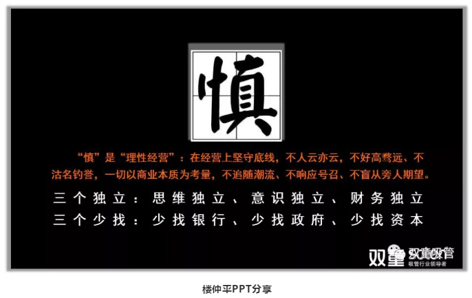 答:在流變時(shí)代下,企業(yè)要很好的“活著”,要有品質(zhì)、有尊嚴(yán)、有溫情、有責(zé)任、可持續(xù)發(fā)展,首先要具備的就是“慎”。在經(jīng)營上要有自己的獨(dú)立判斷,堅(jiān)守底線,不人云亦云,一切以商業(yè)本質(zhì)為考量,不追隨潮流、不響應(yīng)號(hào)召、不盲從旁人期望?;谝陨?,樓仲平也總結(jié)出“三個(gè)獨(dú)立”和“三個(gè)少找”: