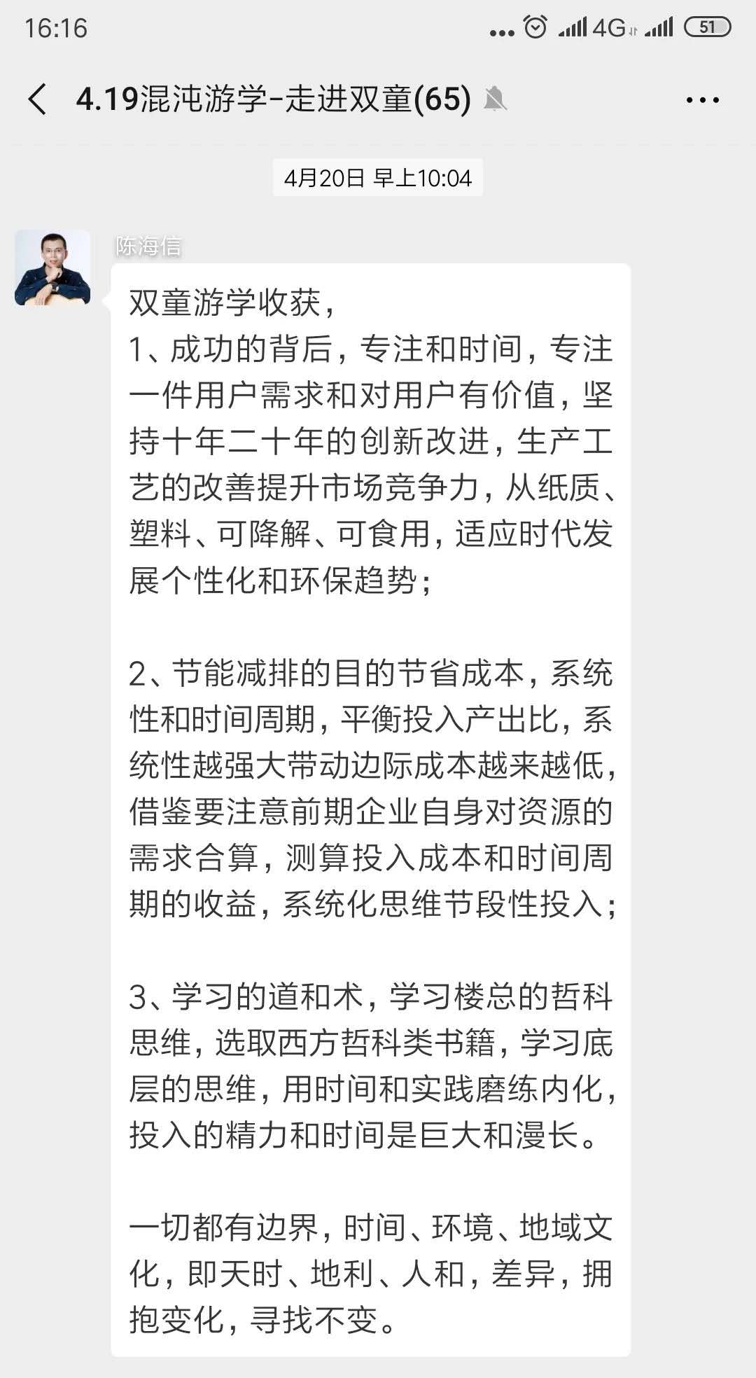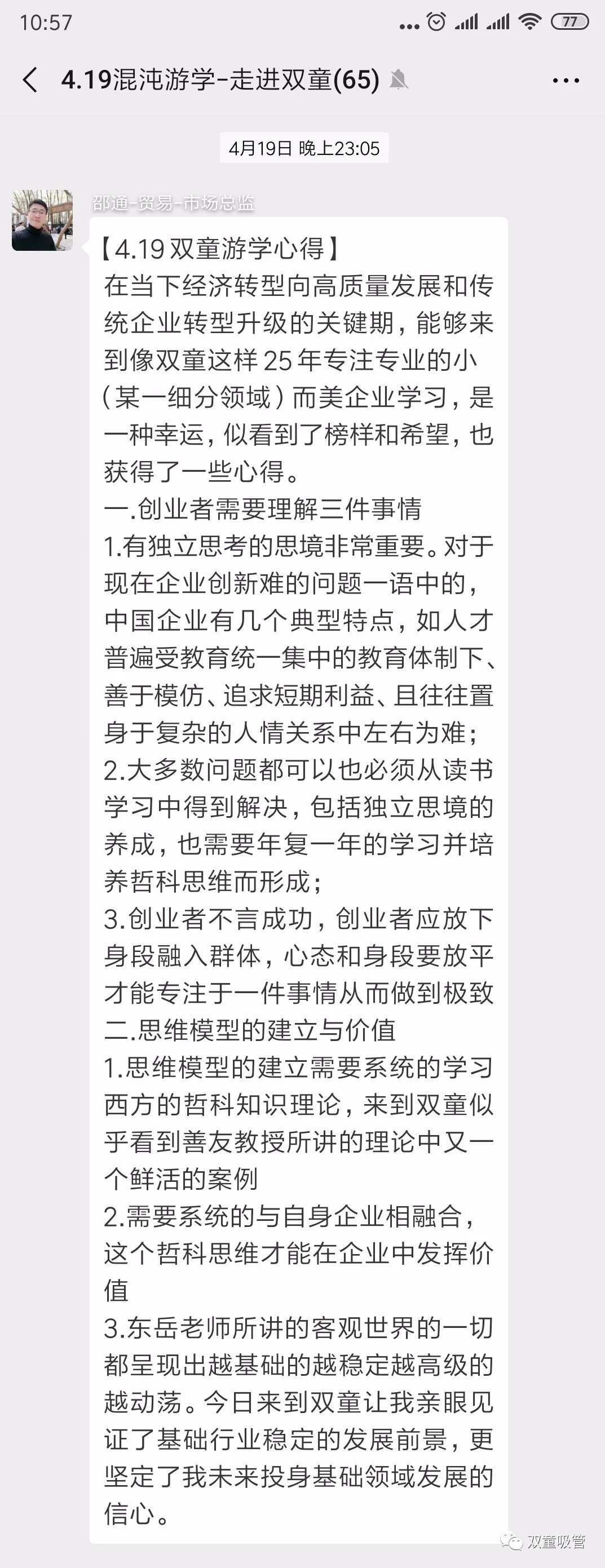 “這是一次刷新認(rèn)知的游學(xué),讓我對(duì)傳統(tǒng)行業(yè)有了極大的改觀”。這是上周五下午,混沌大學(xué)杭州分社的同學(xué)們在“雙童”游學(xué)后發(fā)出的最深刻的反饋。