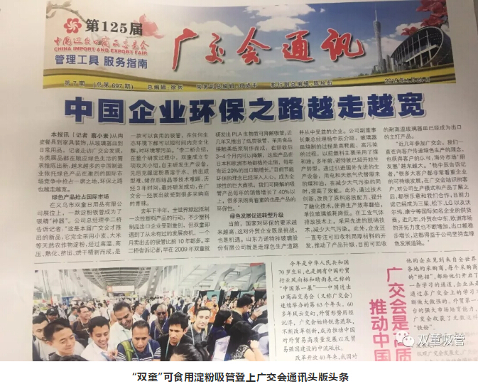 “雙童”可食用淀粉吸管除了吸引了大批客商之外,也引起了媒體朋友們的關注?!半p童”可食用淀粉吸管作為中國企業(yè)環(huán)保案例登上了廣交會通訊報的頭版頭條,在廣交會上一炮打響!