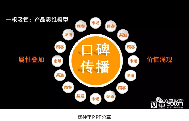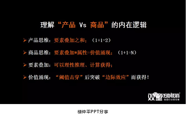 接著,樓仲平引導(dǎo)大家思考“產(chǎn)品 VS 商品”的關(guān)系,在這個模型中,產(chǎn)品本身(一根吸管)只是組成“商品”的基礎(chǔ)核心,是最基本的要素疊加之和,1+1=2。