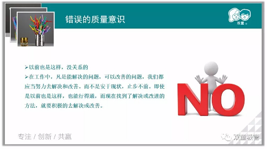最重要的,就是樹立正確的質(zhì)量意識。在工作中,凡是能解決的問題,可以改善的問題,我們都應(yīng)當努力去解決和改善,而不是安于現(xiàn)狀,止步不前。即使是以前也這樣能行得通,但現(xiàn)在找到了解決或改進的方法,就要積極的去解決或改善。
