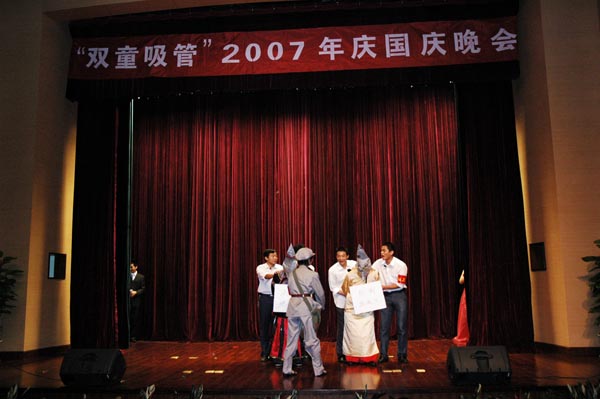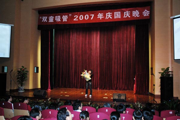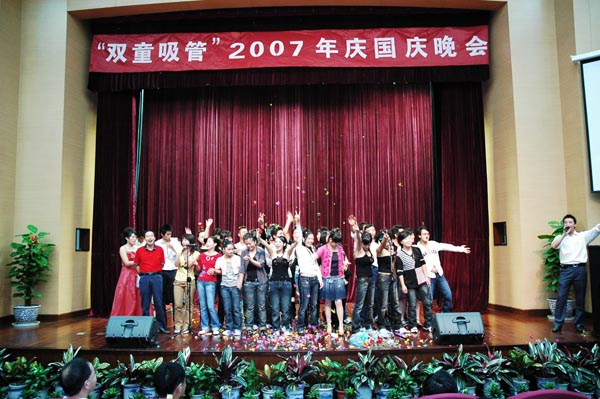 2007年10月1日,雙童公司舉辦了慶國慶晚會(huì),各級(jí)領(lǐng)導(dǎo)和嘉賓、全體員工、部分員工家屬都參加了本次活動(dòng),晚會(huì)包含13個(gè)歌唱、5個(gè)舞蹈、3個(gè)小品、2個(gè)相聲、2個(gè)游戲等節(jié)目,經(jīng)過員工自編自演、精心排練和準(zhǔn)備,得到員工一致好評(píng)。