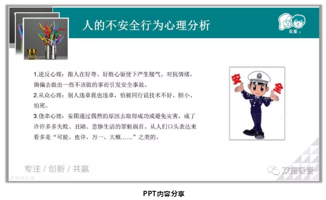 緊接著,李講師也分析了人的不安全行為心理,違章的人一般都有著逆反心理、從眾心理、僥幸心理、冒險(xiǎn)心理…… 他們?cè)趯?shí)際操作中始終抱著僥幸心理,錯(cuò)誤地認(rèn)為“違章不一定出事,出事不一定傷人,傷人不一定傷己,傷己不一定死人”,從而導(dǎo)致各類安全事故的發(fā)生!李講師也警醒同學(xué)們:在工作和生活當(dāng)中千萬不要抱有這幾種心態(tài),避免安全隱患的發(fā)生!