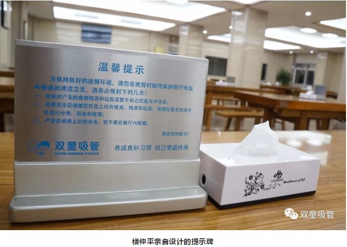 食堂餐桌上,擺放著樓仲平親自設計的提示牌,標注的文字并不“可愛”:用餐者把食物殘渣放置在托盤中;用餐完畢后,在洗手處把碗具和餐后垃圾分類投放;嚴禁在桌椅上涂鴉。