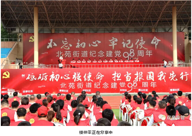 這不,6月29日上午,北苑街道為紀(jì)念中國(guó)共產(chǎn)黨成立98周年,開(kāi)展了建黨98周年慶“七一”專(zhuān)題千人大黨課?!半p童”樓仲平也受邀參加了此次活動(dòng),并受聘擔(dān)任了垃圾分類(lèi)宣傳大使!