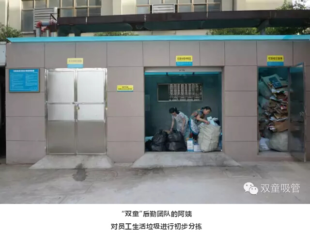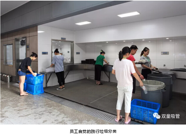 4.“雙童”大部分濕垃圾(餐廚垃圾)在餐廳的源頭給予分類(lèi),通過(guò)教育培訓(xùn)并在每張餐桌上都擺放著垃圾分類(lèi)的標(biāo)語(yǔ)提示牌,提醒員工們就餐后及時(shí)按食物垃圾、衛(wèi)生紙、包裝物三種類(lèi)別分類(lèi)投放于洗碗出三個(gè)大桶中,其中的包裝物和紙張垃圾作為資源類(lèi)垃圾回收、食物垃圾供應(yīng)給養(yǎng)殖戶(hù)作飼料回收,從而把企業(yè)所有的濕垃圾全部消滅;
