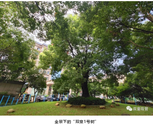 現(xiàn)在的“雙童1號樹”已經(jīng)是郁郁蔥蔥的一片啦,普通的手機(jī)相機(jī)根本容不下它了!在全景模式的拍攝下,終于把這位“大巨人”給收下啦!怎么樣,拍的效果還不錯(cuò)吧?