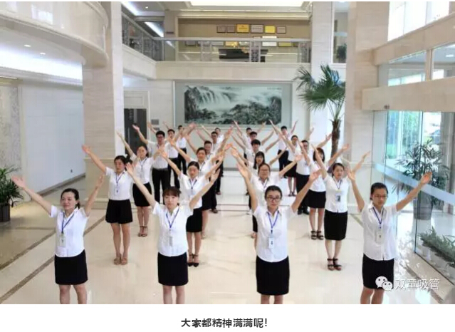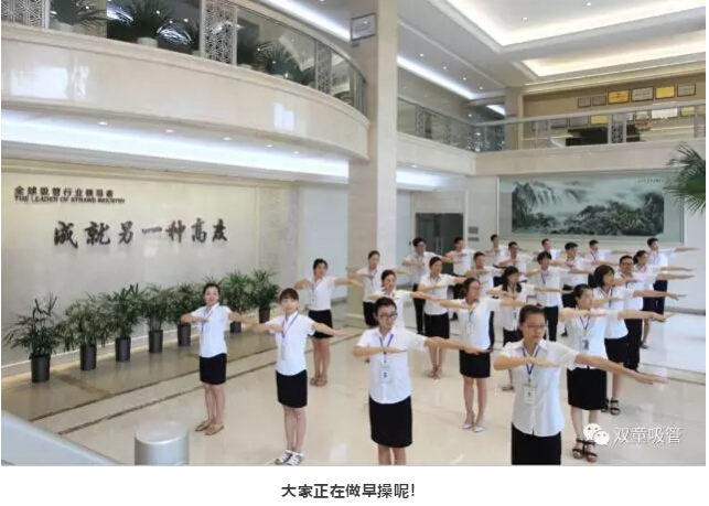 除了精神上要得到提升之外,我們的身體素質(zhì)也非常重要!每天,在晨讀環(huán)節(jié)結(jié)束之后,我們都會進(jìn)行早操活動。俗話說,“一年之際在于春,一天之際在于晨”。在“雙童”行政大廳,員工們列隊(duì)整齊,精神飽滿,氣宇軒昂,伴著豪邁的音樂,用整齊劃一的動作做起早操,形成了一道靚麗的風(fēng)景線。