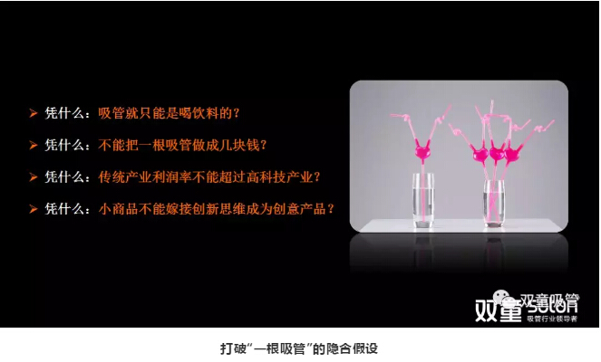 答:在生活中,許多人都容易陷入自身的“隱含假設”中,認為吸管這類產品就是“低、小、散、弱”,但“雙童”卻在2005年提出:吸管不僅僅是用來喝飲料的,這一個認知就打破了“吸管只是用來喝飲料”這個“隱含假設”。