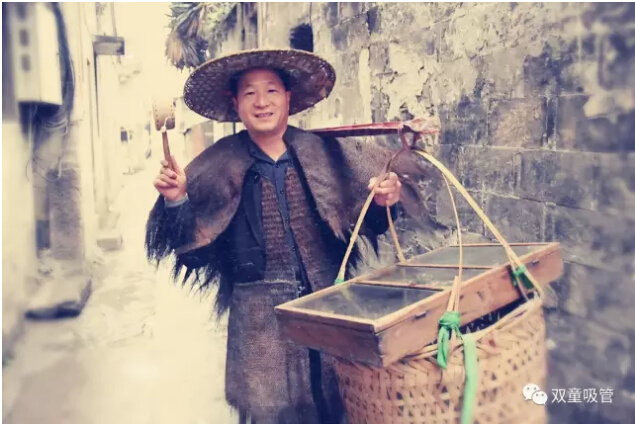 這是“雞毛換糖”人挑貨郎擔(dān)的場景……