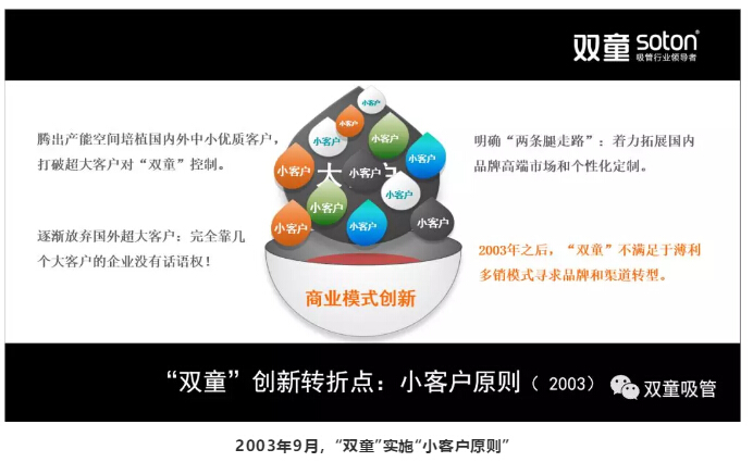 2003年9月,“雙童”實(shí)施“小客戶原則”,通過商業(yè)模式改革,改變了原來薄利多銷的粗放經(jīng)營模式,通過獨(dú)樹一幟的銷售創(chuàng)新形成差異化錯位競爭,逐漸遠(yuǎn)離同行之間惡性競爭,在持續(xù)積累下獲得全球吸管產(chǎn)業(yè)話語權(quán)和規(guī)則制定權(quán)。