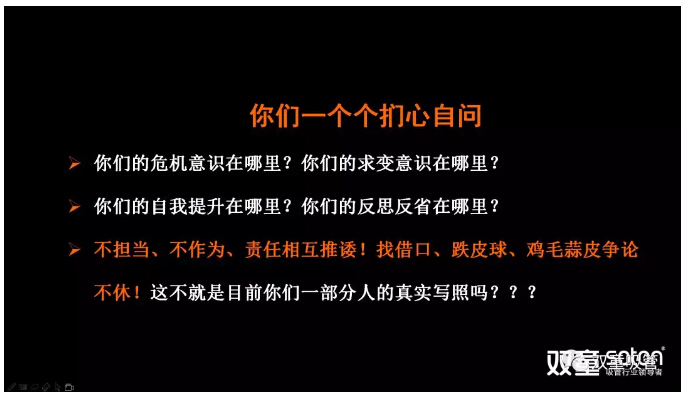“雙童”樓仲平圍繞《危機(jī)重重下“雙童”路在何方?——“向死而生”我們只有六個月!》主題,通過兩個多小時的深入分享,讓行政員工們意識到“雙童”目前存在的嚴(yán)重問題,引導(dǎo)大家認(rèn)識自我、反思批判,打開思想的缺口!