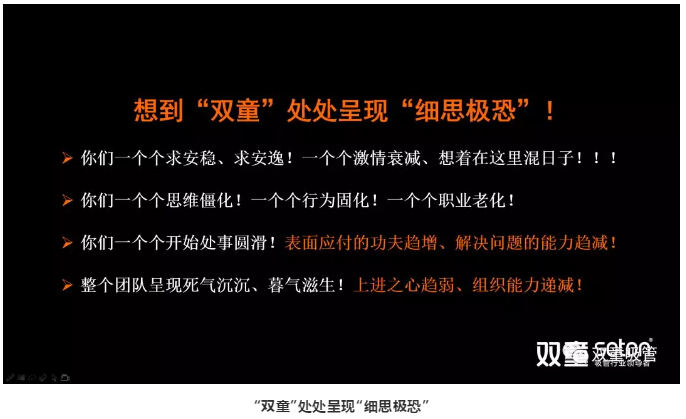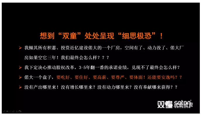 或許,大家覺得“雙童”發(fā)展的很好,為什么會“死”?為什么離“死亡”只有六個月?為什么時隔七年(2011年,“雙童”推動經(jīng)理人再造重大變革)再次推動企業(yè)重大改革?