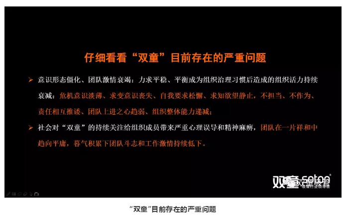 緊接著,樓仲平帶領(lǐng)大家進(jìn)入第二章節(jié),引導(dǎo)大家捫心自問:“雙童”的問題在哪里?從而讓組織在‘死’前尋求延續(xù)生存機(jī)會!