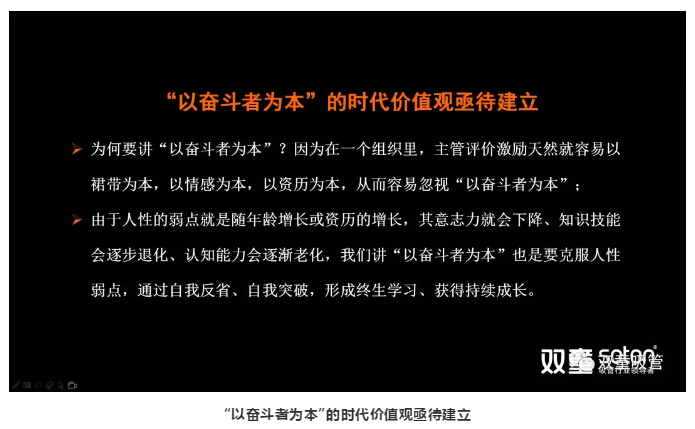 為什么要以“奮斗者為本”?由于人性的弱點(diǎn)就是隨年齡增長或資歷的增長,其意志力就會下降、知識技能會逐步退化、認(rèn)知能力會逐漸老化,我們講“以奮斗者為本”也是要克服人性弱點(diǎn),通過自我反省、自我突破,形成終生學(xué)習(xí)、獲得持續(xù)成長!
