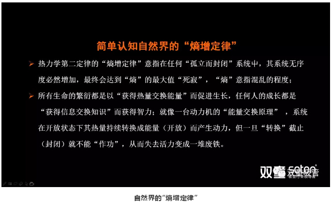 “熵增定律”意指在任何“孤立而封閉”系統(tǒng)中,其系統(tǒng)無序度必然增加,最終會達(dá)到“熵”的最大值“死寂”。任何一個人,任何一個組織,乃至于任何一個家庭,如果你把自己封閉起來,你的內(nèi)部一定是從有序到無序。如果你繼續(xù)封閉,它的混亂程度一定會達(dá)到最大值,一直到死寂。